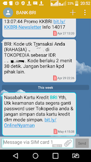 Sebuah SMS dari Bank BRI masuk ke ponsel saya pada Senin, tanggal 4 Mei 2020. Isinya meminta saya mengganti password user Tokopedia, dan jangan menyimpan data Kartu Kredit di Tokopedia. Belum lama ini saya memang melakukan transaksi di Tokopedia memakai Kartu Kredit BRI, tetapi transaksi itu sudah selesai tanggal 29 April 2020 yang lalu. Jadi saya tidak mengerti maksud BRI meminta saya mengganti password, dan mengabaikan SMS ini.